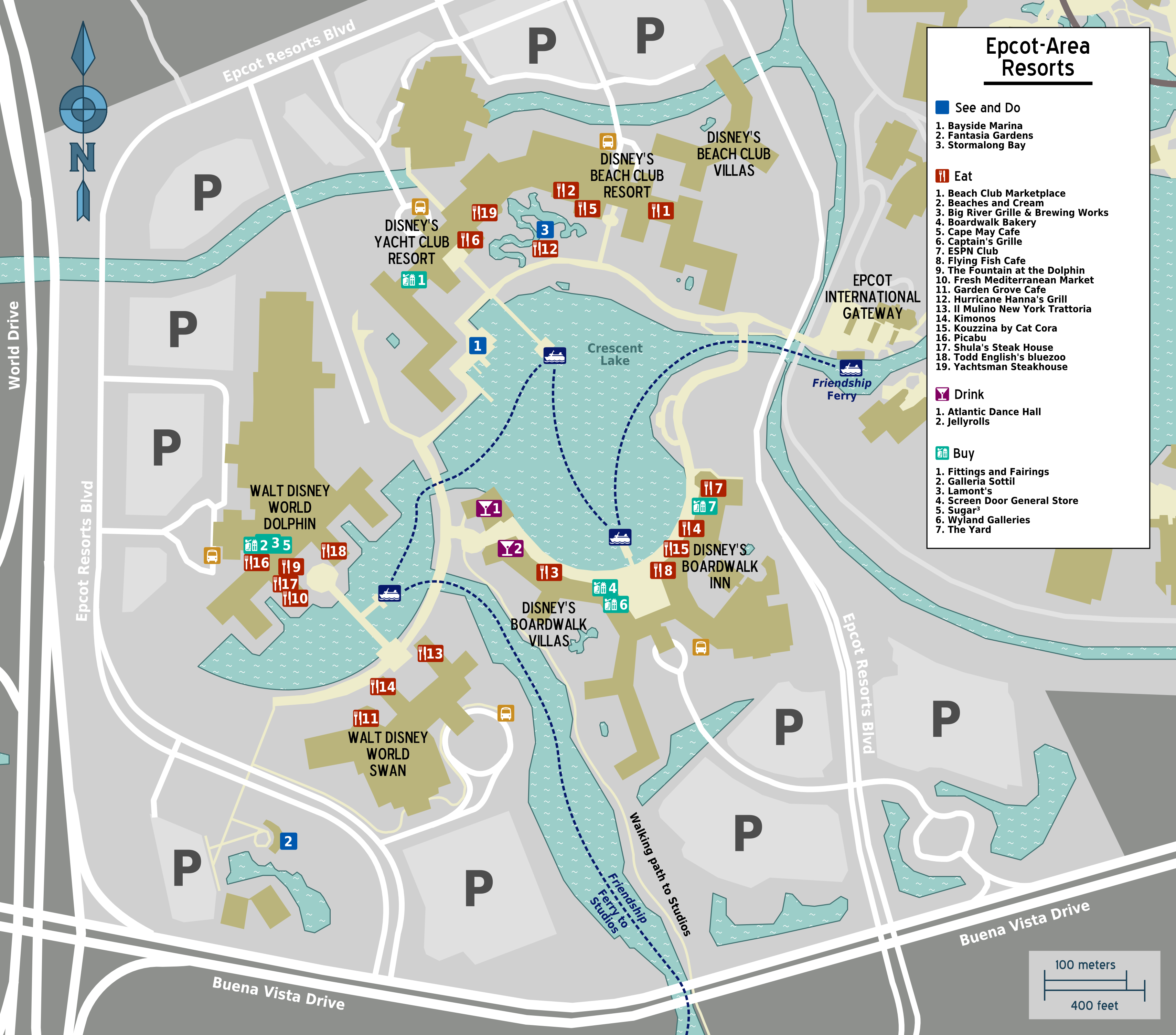 There are boats that travel to both Magic Kingdom.. and to Epcot. The maps for those can be seen here. There are also boats that can be taken from nearby resorts to Disney Springs (not pictured).