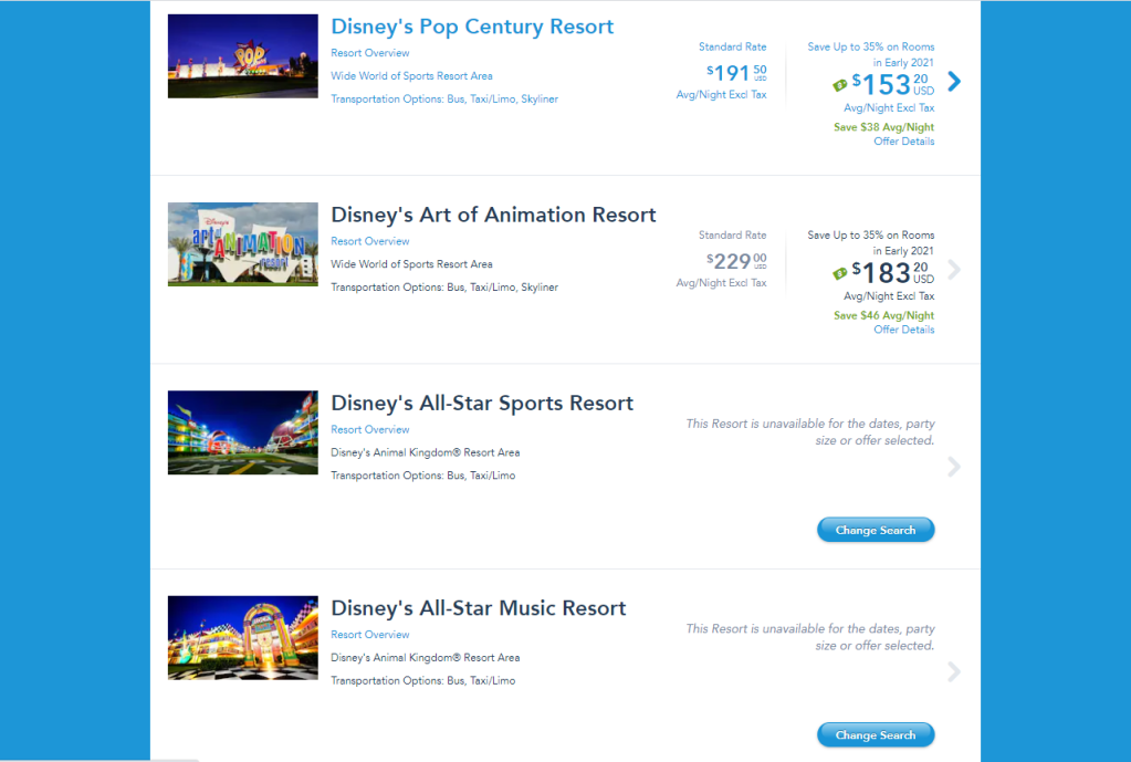 Your resort choice (which is one of the first decisions you make) will determine WHAT modes of transportation you use your entire trip! When booking online, you’ll type in your dates.. and the options that are available to you will pop up. Under each resort, you’ll see “Transportation Options”. Disregard the “taxi/limo” option- we’re only talking here about the options that are FREE to you with your resort stay. So Pop, for example, has two transportation options- Skyliner and Bus.